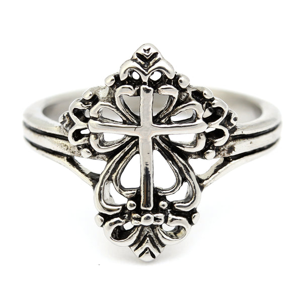 Beautiful silver cross filigree ring that is somewhat bohemian style with a touch of vintage accentuated by the black highlights in the ring.