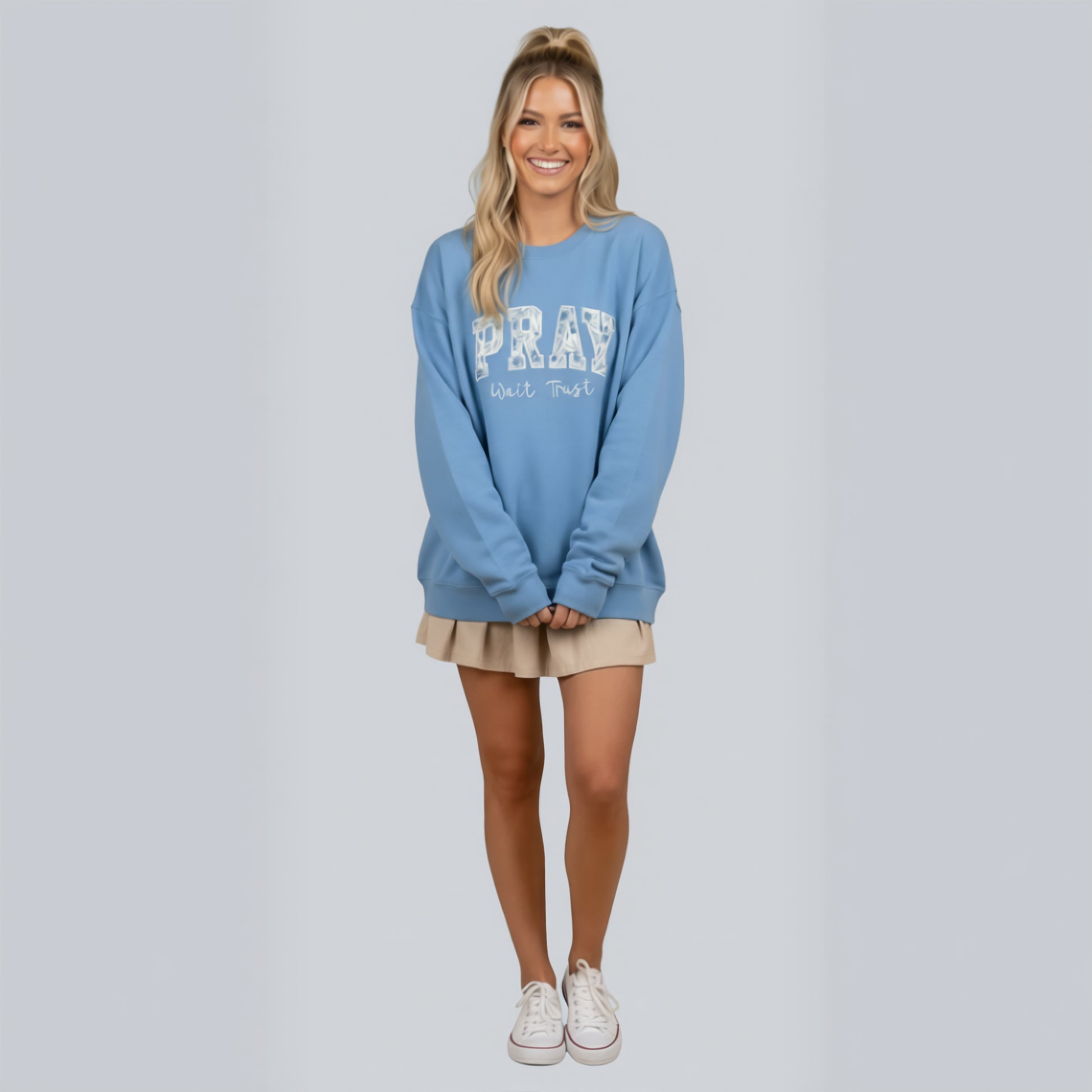 Designed as a quiet reminder to trust God’s timing, the PRAY “Wait Trust” crewneck sweatshirt is thoughtfully designed, created, and embroidered in Colorado. Blending meaningful faith-inspired design with true artisan craftsmanship, each piece is intentionally made and completely unique.